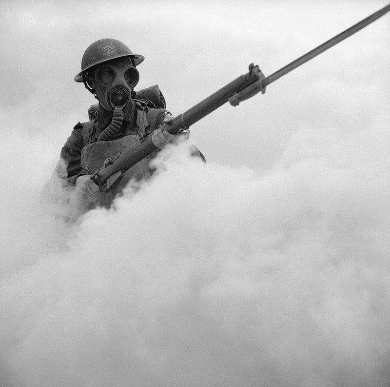 15. 1941 में WWI के दौरान यूज़ किये जाने वाले उपकरणों से ट्रेनिंग करता हुआ ब्रिटिश सैनिक.