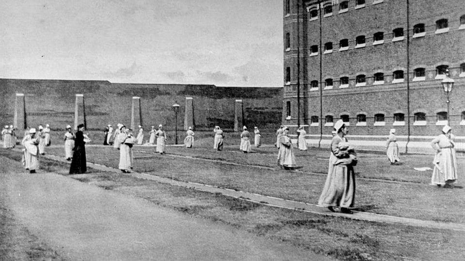 1. लंदन में वर्मवुड स्क्रब जेल के एक्सरसाइज़ यार्ड में अपने बच्चों के साथ टहलती महिलाएं – 1890